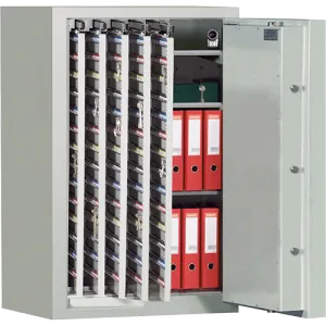 Schlüsseltresor Baureihe DRESDEN-COSWIG Finden Sie eine große Auswahl von Tresoren in unseremTRESORFINDER Schlüsseltresor der Modellreihe DRESDEN-COSWIG, speziell zur Nutzung im gewerblichen Bereich entwickelt. Die besonders stabile Ausführung bietet eine enorme Aufnahmekapazität. Ein weiteres, überzeugendes Merkmal dieser Modellreihe ist die vielfältige Nutzungsmöglichkeit. Einige Modelle besitzen zusätzliche Fachböden. Hier finden Aktenordner oder diverse Wertgegenstände Platz. Gehäuse und Tür sind mehrwandig und mit speziellen Dichtungen ausgestattet. In den Wandungen befindet sich hitzebeständiges Material. Dadurch sind 30 Minuten Feuersicherheit für Papier gegeben. Das 104 mm starke Türblatt wird an 3 Seiten mit massiven Bolzen verriegelt und auf der Scharnierseite mit einem durchgehenden Hintergreifprofil gesichert. Durch außen liegende Scharniere ergibt sich ein Türöffnungswinkel von 180 Grad. Der Türanschlag befindet sich DIN rechts. Die robuste Konstruktion bietet Einbruchschutz vor thermischen und mechanischen Werkzeugen (30/50 RU). Zur serienmäßigen Ausstattung gehört ein Doppelbartsicherheitsschloss mit 2 Schlüsseln, 120 mm lang. Gegen Aufpreis ist auch ein elektronisches oder mechanisches Zahlenschloss erhältlich. Alle Modelle dieser Serie sind zur Bodenverankerung vorgerichtet. Auf Zwischenwänden, die auf Präzisionsauzügen laufen, befinden sich stufenlos verstellbare Hakenleisten (farbig hinterlegt, nicht nummeriert). So kann schnell der gesuchte Schlüssel gefunden werden. Hersteller ISS - Inter Sicherheits Service GmbH Sicherheitsstufe Sicherheitsstufe Klasse 1 nach EN 1143-1 Grad 1 IMP Sicherheitsstufe VdS Klasse 1 nach EN 1143-1 Grad 1 Brandschutzklasse Feuerschutz / Brandschutz LFS 30 P nach prEN 15659, 1/2 h Feuerschutz für Dokumente RAL Farbe RAL 7035, lichtgrau