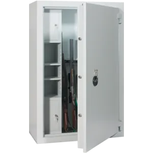 Waffentresor Baureihe JAGD N Finden Sie eine große Auswahl von Tresoren in unseremTRESORFINDER Waffenschrank der Modellreihe JAGD N, mit allen Eigenschaften, die gesetzlich für die Lagerung von Langwaffen erforderlich sind. Die Serie beinhaltet 8 Modelle unterschiedlicher Größe und Ausstattung. Die großvolumigen Schränke sind mit Doppeltüren ausgestattet (Modell 52, 55 und 60). Der Türanschlag der anderen Schränke befindet sich DIN rechts. Vielfältig nutzbar sind die kleineren Waffenschränke (Modell 50, 51 und 52). Sie sind durch eine Trennwand geteilt. Seitlich davon befinden sich 2 Innentresore, jeweils oben und unten. Der Zwischenraum ist mit höhenverstellbaren Fachböden ausgestattet. Beide Innentresore sind separat abschließbar (Zylinderschloss) und eigenen sich zur Aufbewahrung von Munition. Außerdem bieten sie Platz für DIN A 4 Ordner. Alle Waffenschränke der Modellreihe JAGD N sind an der Türinnenseite mit Putzstockhalterung und Staufächern für Zubehör ausgestattet. Schaumstoffwaffenhalter, die in der Höhe verstellt werden können, sorgen für Flexibilität bezüglich der Waffenlänge. Je nach Schrankgröße sind zwischen 4 und 18 Waffenhalter vorhanden. Ein entscheidender Gesichtspunkt ist sowohl der VdS-zertifizierte Einbruchwiderstand, als auch die hohe Versicherungseinstufung (privat bis 40.000,- € / gewerblich bis 10.000,- €). Voraussetzung ist die fachgerechte Bodenverankerung, welche serienmäßig vorbereitet ist. Die mehrwandige Bauart von Tür und Korpus bietet garantierten Schutz gegen Angriffe mit mechanischen und thermisch wirkenden Einbruchwerkzeugen (30/30 RU). Zur Verriegelung der massiven Tresortür (105 mm stark) dient ein Rundbolzenriegelwerk und ein Doppelbartsicherheitsschloss mit 2 Schlüsseln, Schlossklasse 1. Alternativ sind diverse Kombinationsschlösser gegen Aufpreis lieferbar. Hersteller Hossbach Metallbau-Gerätebau GmbH Sicherheitsstufe Sicherheitsstufe VdS Klasse N/0 nach EN 1143-1 Grad 0 Brandschutzklasse Kein zertifizierter Brandschutz / Feuerschutz RAL Farbe RAL 7035, lichtgrau RAL 7016, anthrazitgrau